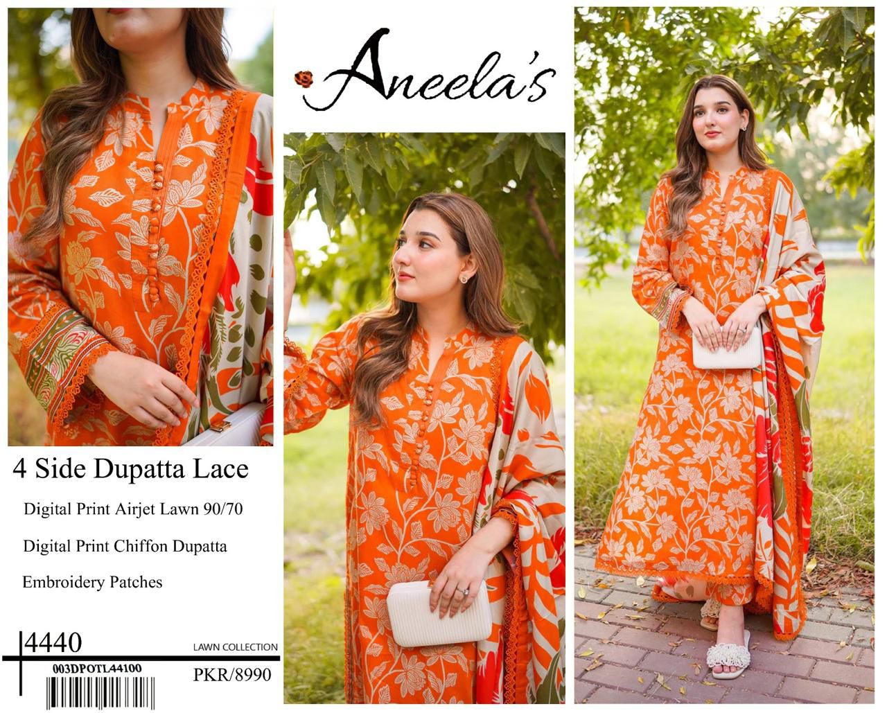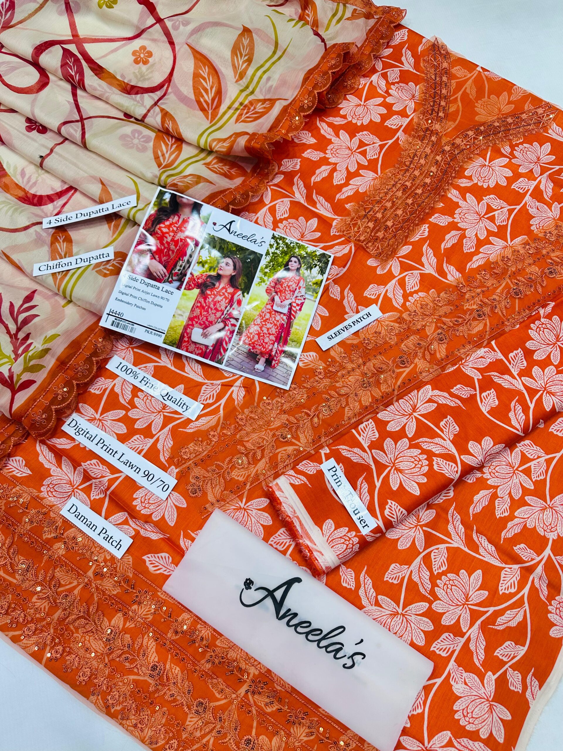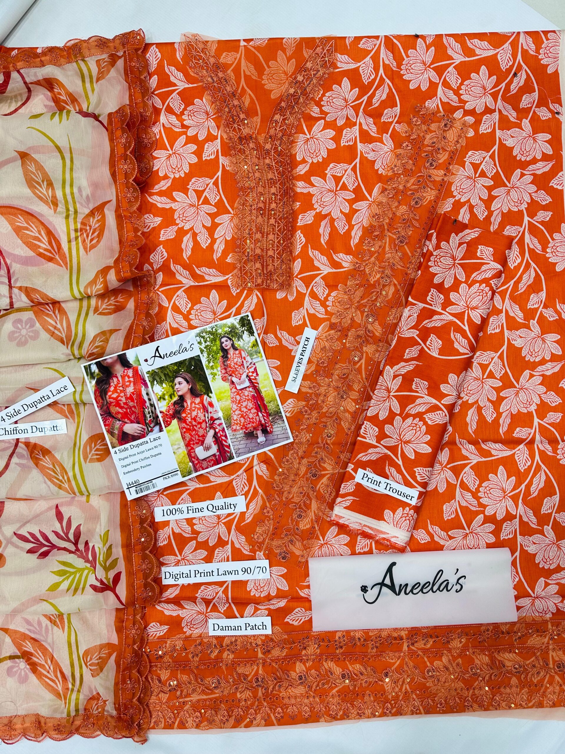 Digital Print AirJet Lawn 90/70 With 4-Side Lace Chiffon Dupatta