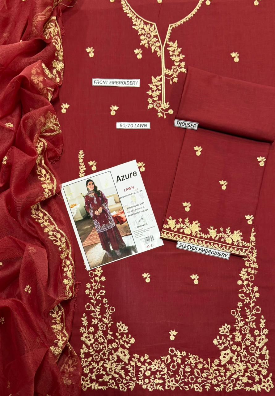 Azure | Lawn Embroidered 3pc | Maroon Gilded Bouquet