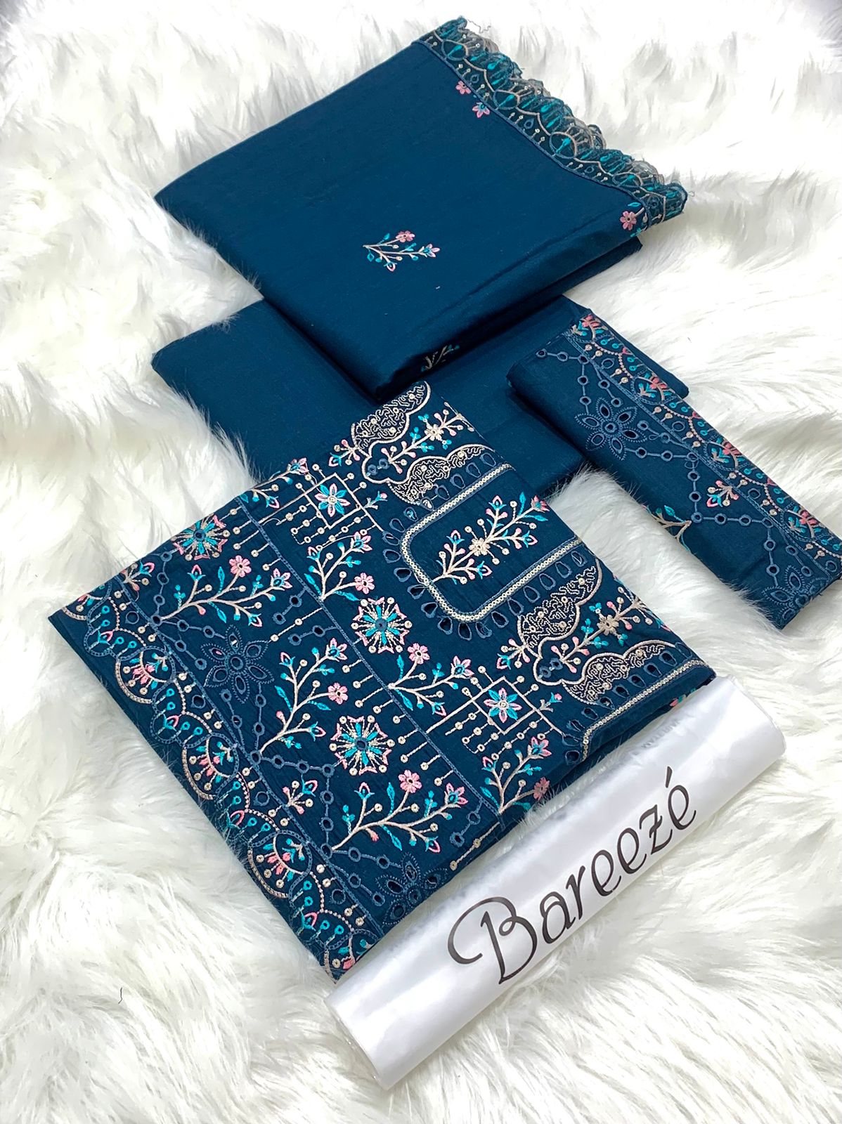 BAREEZE | Lawn Embroidered 3pc | Deep Teal & Rosy Vine