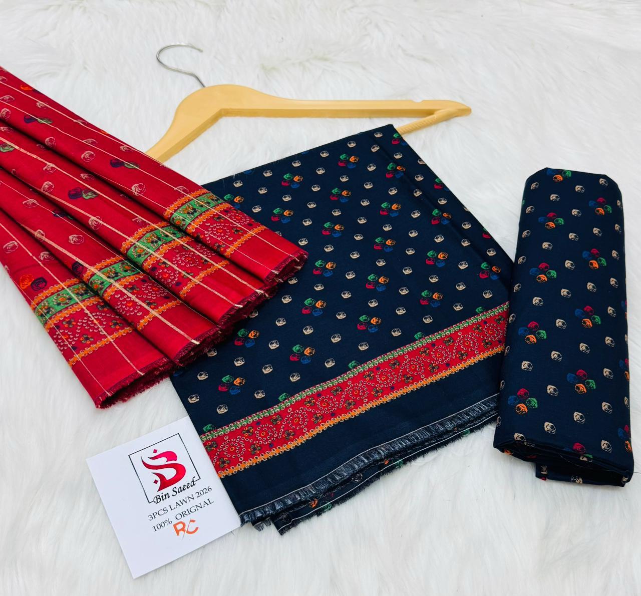 Bin Saeed | Lawn 3pc | Midnight Polka & Scarlet Chunri