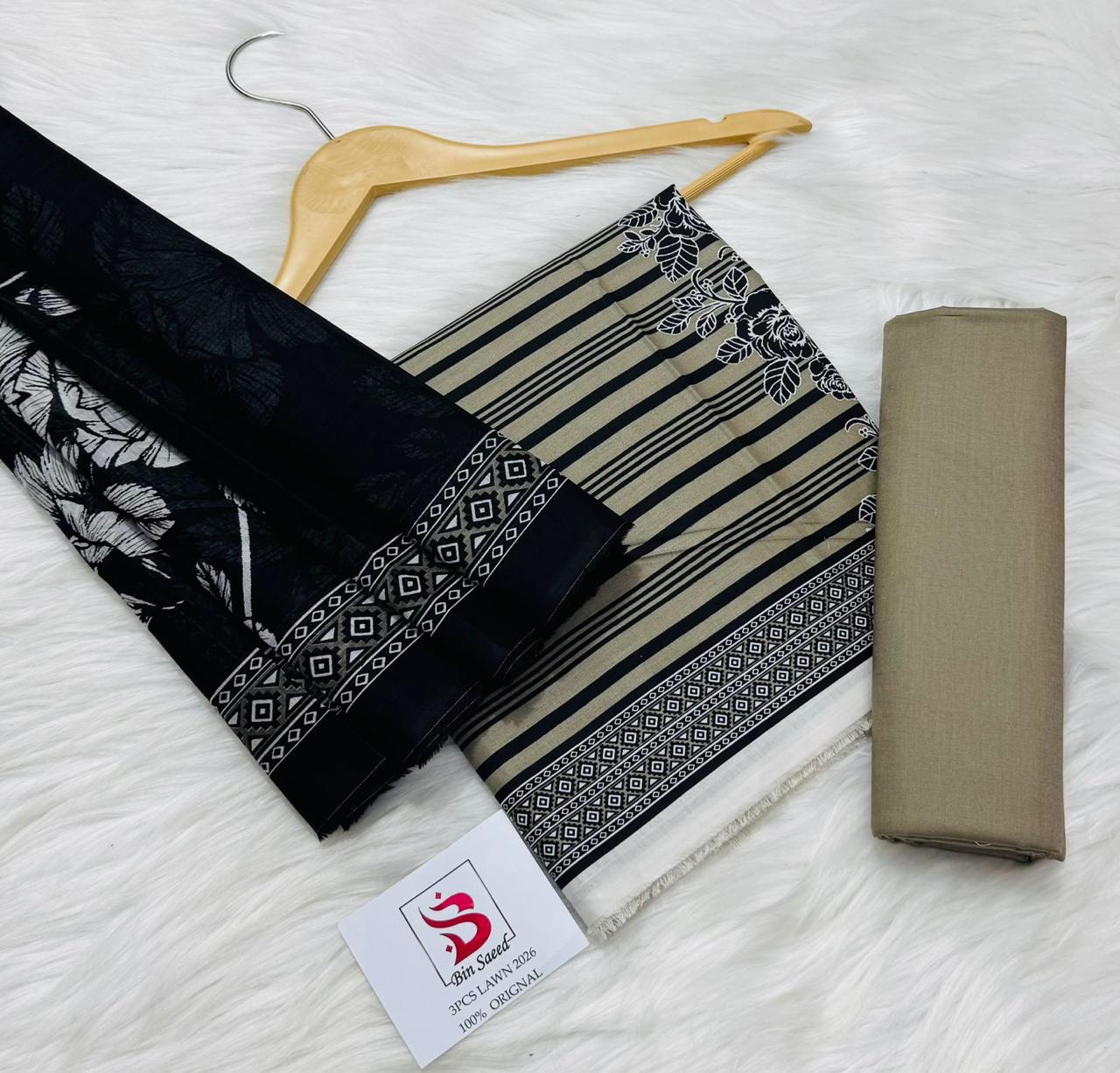 Bin Saeed | Lawn 3pc | Olive Stripes & Black Flora