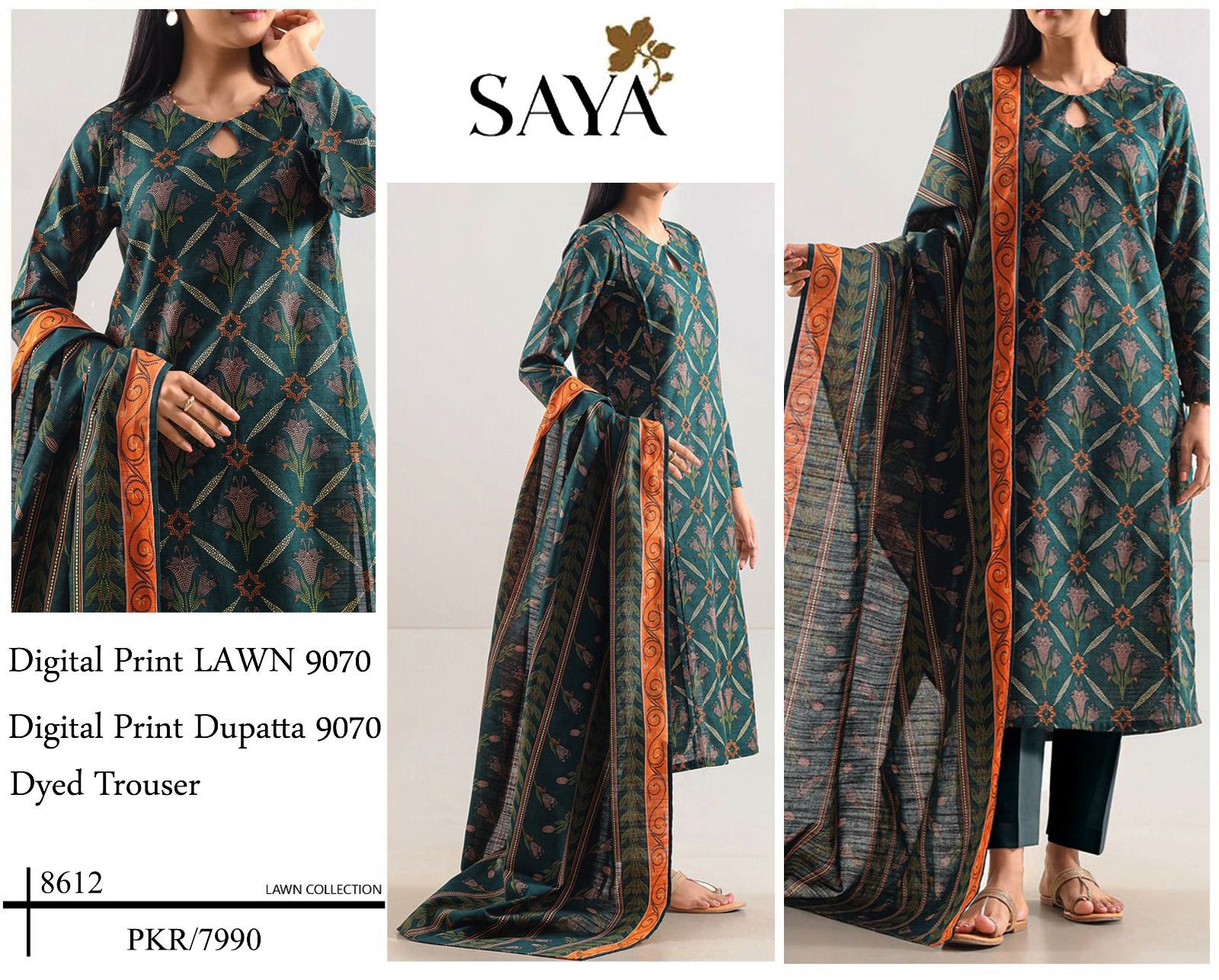 SAYA | Lawn 3pc | Teal Green & Amber Border