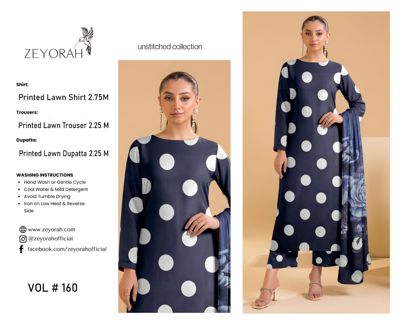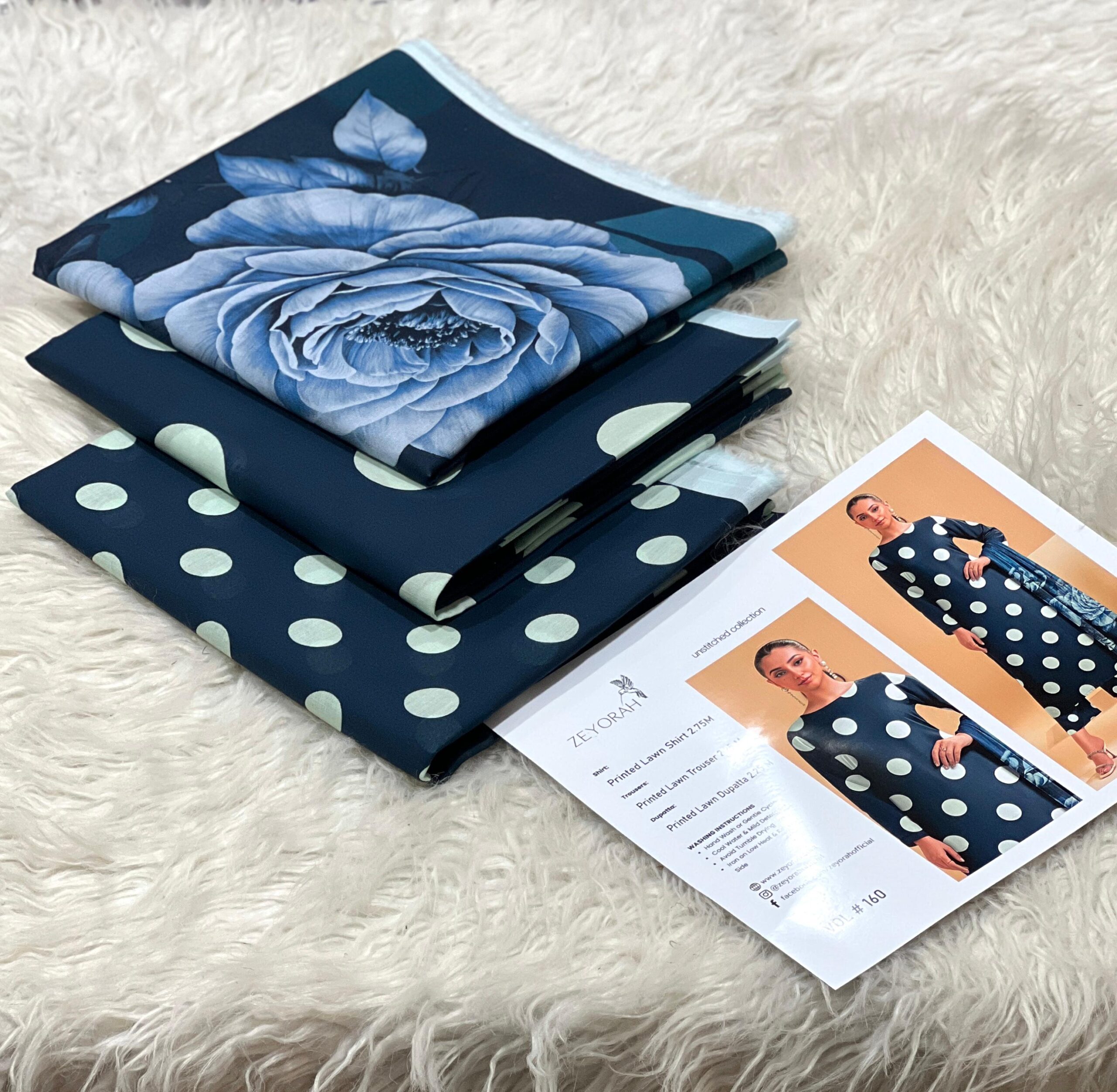 Zeyorah | Lawn 3pc | Navy Blue Bold Polka Dot